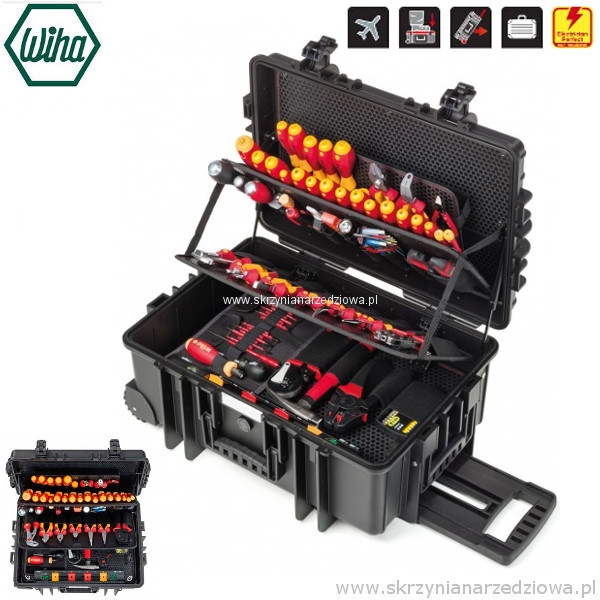 Przegródki skrzynki narzędziowej na zestawy 115-częściowe Competence XXL II dla elektryków są skonstruowane z myślą o efektywnej pracy, dlatego też wszystkie narzędzia są szybko i łatwo dostępne. Dzięki bogatemu wyposażeniu elektryk ma zawsze pod ręką narzędzie odpowiednie do każdego zastosowania, np. uchwyt na bity LiftUp electric z magazynkiem, całkowicie izolowany wkrętak serii Wiha Slim bądź szczypce instalacyjne TriCut. Ponadto obszerne wnętrze skrzynki narzędziowej kryje w sobie poziomicę zaprojektowaną specjalnie do prac przy instalacjach elektrycznych. Skrzynka narzędziowa wykonana z mocnego tworzywa polipropylenowego jest dodatkowo wyposażona w amortyzatory gazowe, utrzymujące pokrywę w różnych pozycjach i uniemożliwiające jej automatyczne zatrzaśnięcie. Dzięki temu można zmniejszyć ryzyko przytrzaśnięcia palców bądź innych urazów.